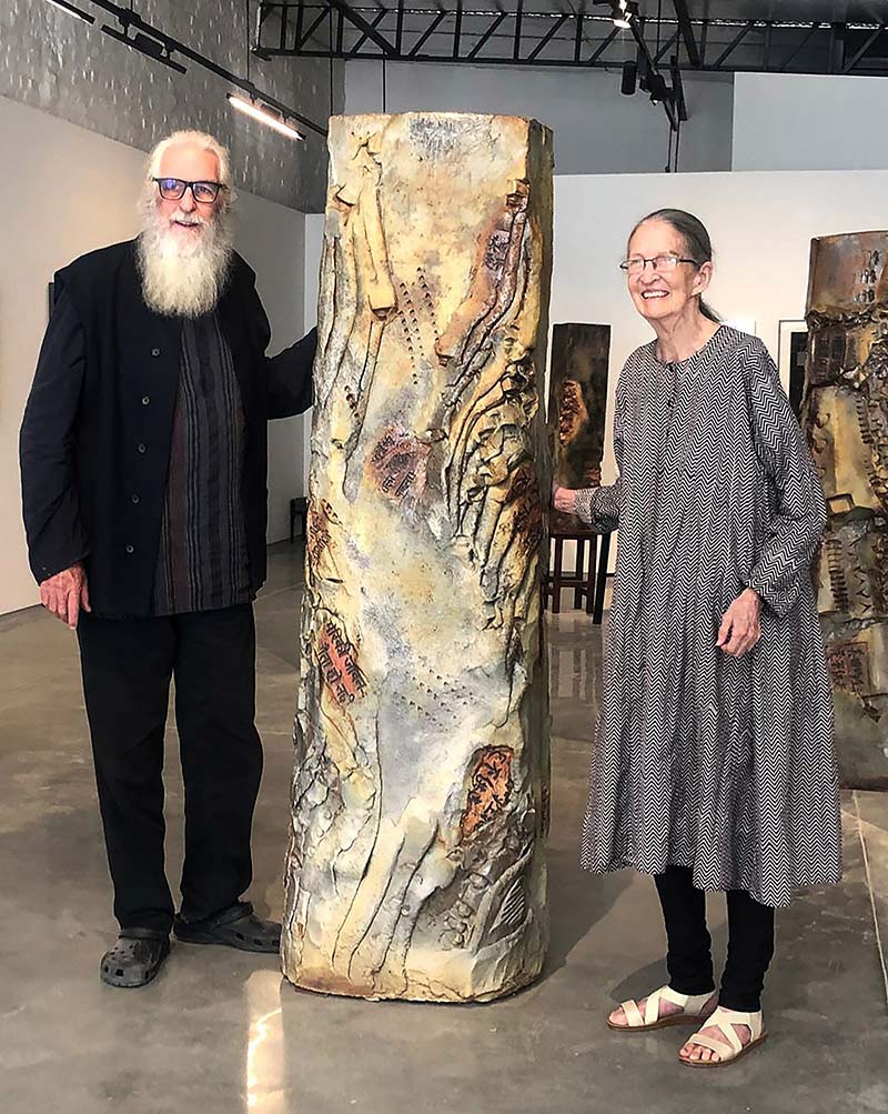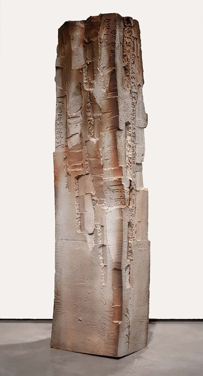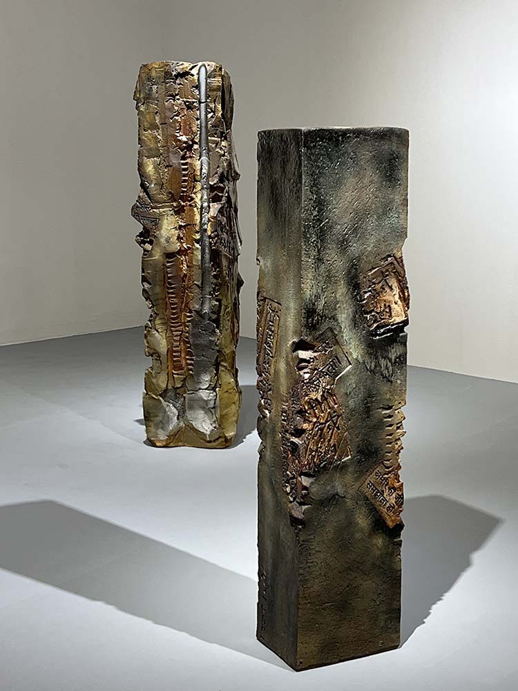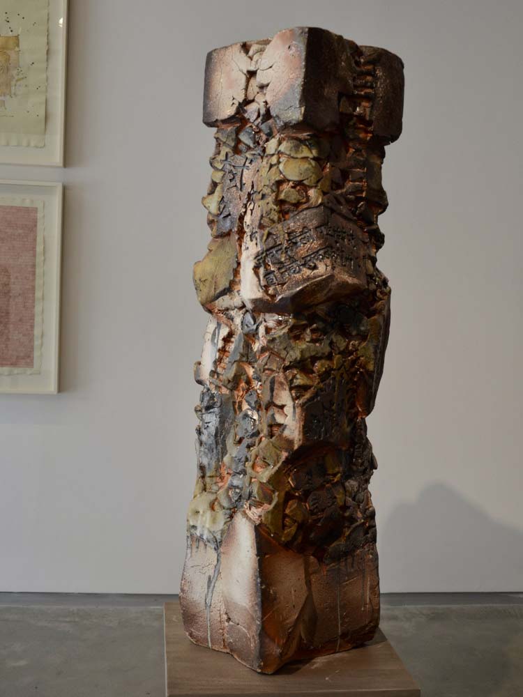 Perhaps anger and frustration felt at human inability to synthesize the obviousness of its current path leading to inevitable demise is expressed in clay through the processes of cutting, hammering, pushing, tearing, scraping, and slapping. And yet, even though this tableau of totemic columns is embedded with the bones and fragments of a violent and desolate past, there resides in these works a residual strength, a silent presence, an elemental harmony. Or, as Emily Dickinson wrote, hope is a thing with feathers.