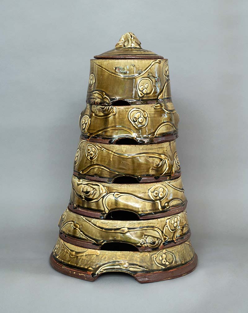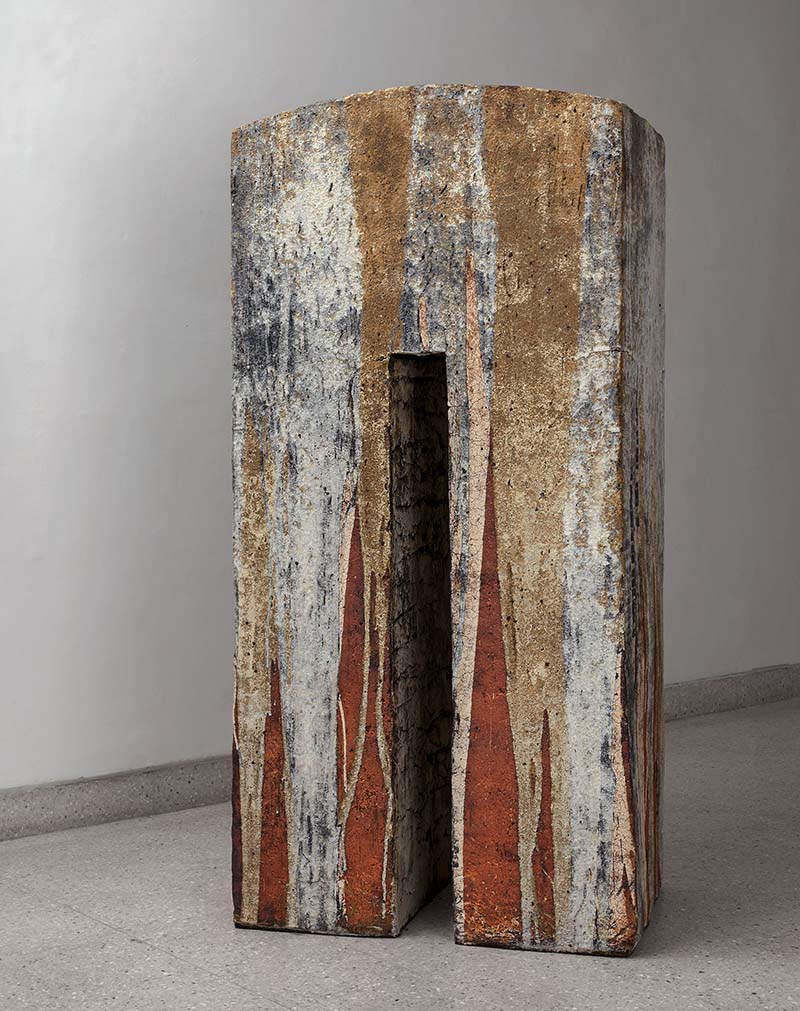 While building the piece, special scaffolding was set up to work on each layer of the form. A special low-shrink clay body was tested out, special wooden pallets fabricated, special stackers with hydraulic pumps added to manoeuvre the parts in and out of the kiln. His 140 cu ft woodfire kiln was fired an incredible 50 times over a two-year period (taking into consideration work made by other artists working alongside at GBP for the commissioned garden). Passage marked a pinnacle of Ray’s audacious and adroit large-scale handling of clay.
