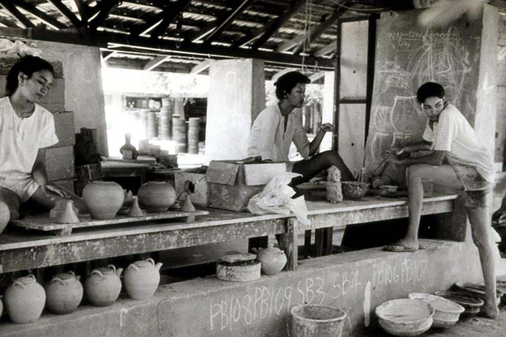 Ray had only intended to be in India long enough to build a kiln for his then-friend, Deborah Smith, who was trying to set up a pottery unit there. India’s languid pace conspired to keep him longer—bricks ordered to build the kiln took six months to arrive! Ray stayed on, constructing the first buildings of what would in time become the institution known as the Golden Bridge Pottery (GBP). And yes, over the next five decades, building a remarkable life with Deborah Smith in Pondicherry, India.