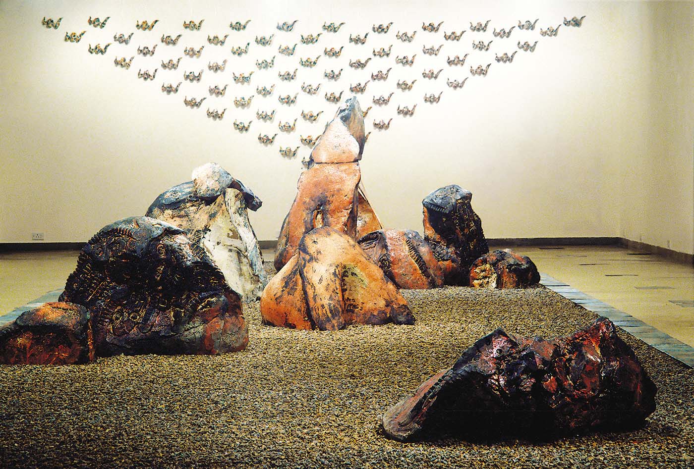 The installation constituted a series of large craggy rock-like formations in high-fired stoneware clay, laid out on a bed of gravel. The abstract forms were imprinted with stamps of nuts and bolts and other mechanical markings, suggesting the remnants of a climacteric industrial past. In the background was a formation of ceramic drones surveying this stark post-apocalyptic landscape. It was both a rage against a flawed developmental model, highlighting the stark consequence of such a direction, as well as a silent plea for a life-sustaining model based on co-existence and mutuality. It was industrial zen—the mute reminder of a war memorial; the suggestive peace of an aftermath. The work was political, passionate, and powerful.