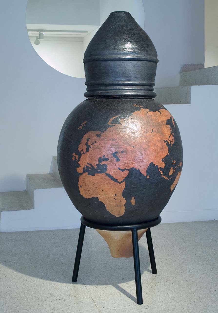 Ray’s next exhibition, 2008’s All the King’s Horses…, continued to offer work birthed from an environmental consciousness. Four large lidded jars, based on ancient funerary urns from Tamil Nadu, and made in collaboration with Tamil village potter T. Pazhanisamy, carried images of the earth’s continents on them. The lids were imprinted with the words “The American lifestyle is not up to negotiation”—a documentation of the stance taken by American President George Bush at the Earth Summit in Rio, 1992. The statement was translated and inscribed in Hindi and Chinese, pointing to the perils of these large populations embracing the consumerist model.