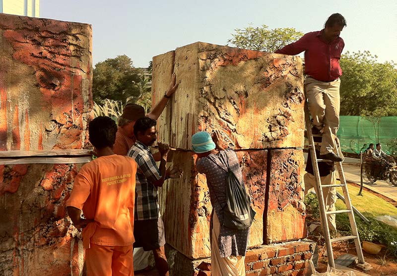 If thus far this article has failed to put enough emphasis on the ground-breaking aspect and technical challenges involved in making and firing massive sculptures in clay, Ray’s 2011 outdoor sculpture Passage serves well to highlight Ray’s resolve and technical mastery in facing and overcoming these challenges. Ray, along with scenographer Rajiv Sethi, co-curated a sculpture garden for a new Hyatt Hotel in Chennai, with works by nine ceramic artists. Ray’s own piece Passage took the form of a massive 21-foot-high gateway— inspired by the statuesque temple gateways of South India—marking the entrance of the hotel. It had a seven-foot-high passage one could walk through.