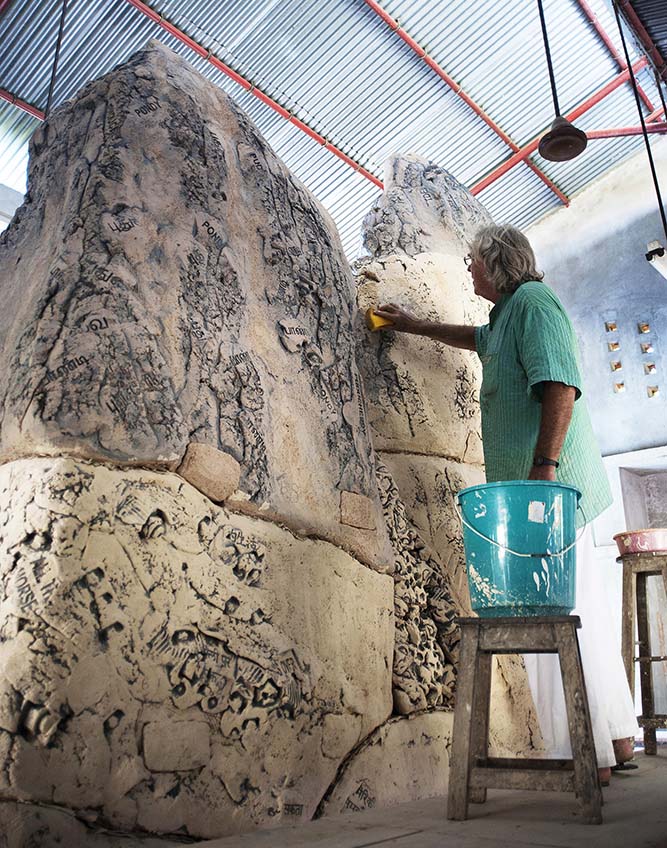 The gargantuan sculpture was made using 17 tonnes of plastic clay. Cut up into several manageable parts that could be fit into the kiln, it was like a gigantic jigsaw that could not be solved or seen in its entirety until its eventual post-firing installation on site. And if any one piece were to be lost during any of the (harrowing) processes of making, drying, firing, transporting, installing on site using cranes—it would be impossible to make and fit again.