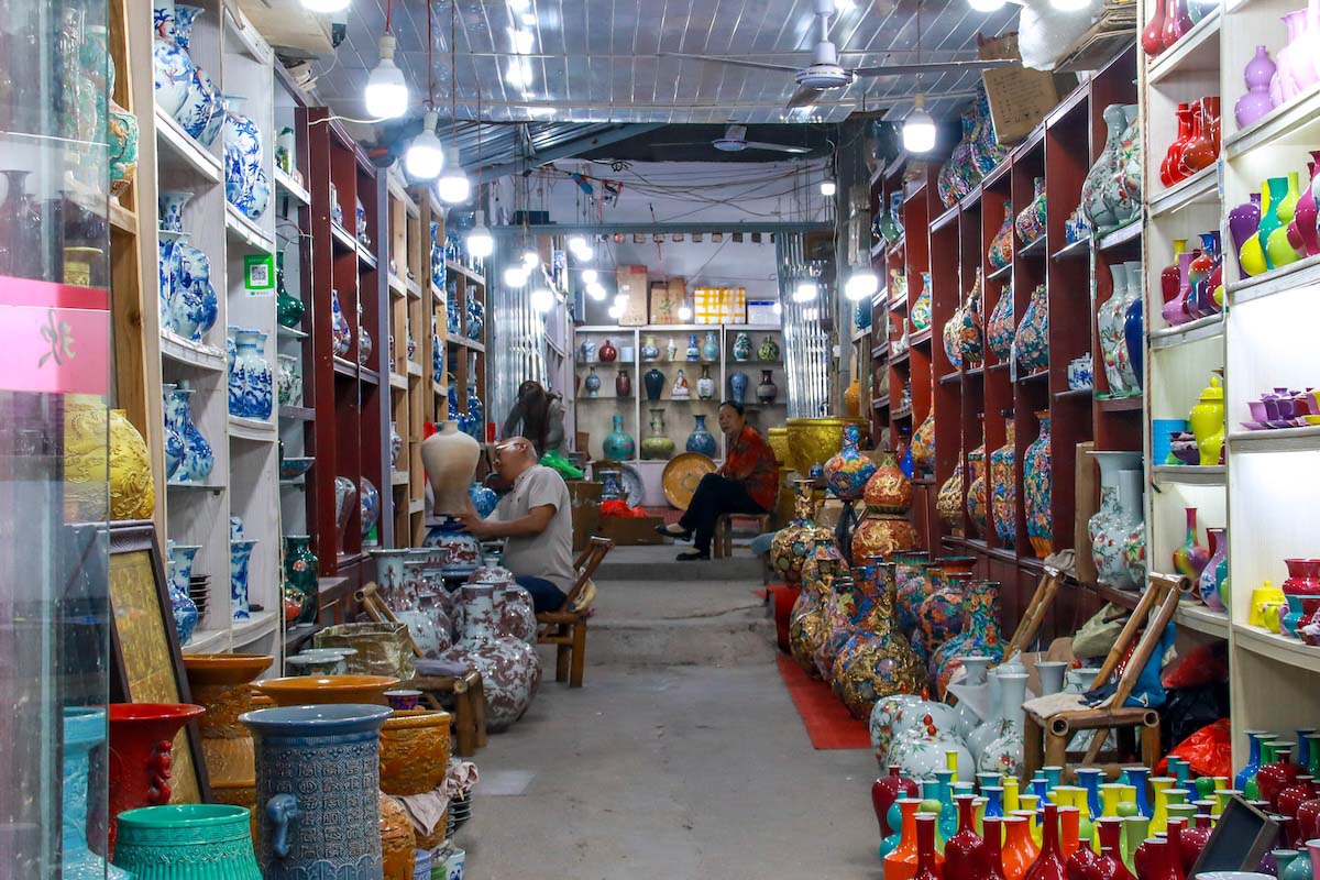 Fanjiajing Street’s defining feature is its unparalleled collection of famous ceramic reproductions. As antique porcelain collecting surged, private workshops sprouted like bamboo shoots after rain, swiftly transforming the area into a bustling market lined with replica shops. Stretching roughly one kilometer north to south, this vibrant street now hosts hundreds of ceramic stores and workshops.